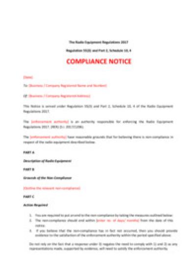 Compliance notice template under reg.55 of the Radio Equipment Regulations 2017.