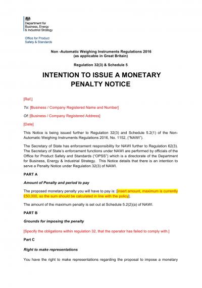 Intention to serve a monetary penalty notice template under reg.32 of the Non-Automatic Weighing Instruments Regulations 2016 for Great Britain.